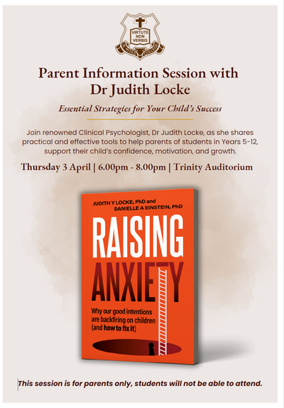 Also, a reminder to RSVP to our parent information evening presented by Clinical Psychologist Dr Judith Locke on Thursday 3 April in Trinity Auditorium. This exclusive session for parents of Years 5-12 SRC students will see Dr Locke share research-backed insights and practical tools to support your child’s confidence, personal motivation, and ability to manage schoolwork demands. Learn how to foster a positive parent-child relationship and prepare your child for success in school and beyond. Click here to RSVP