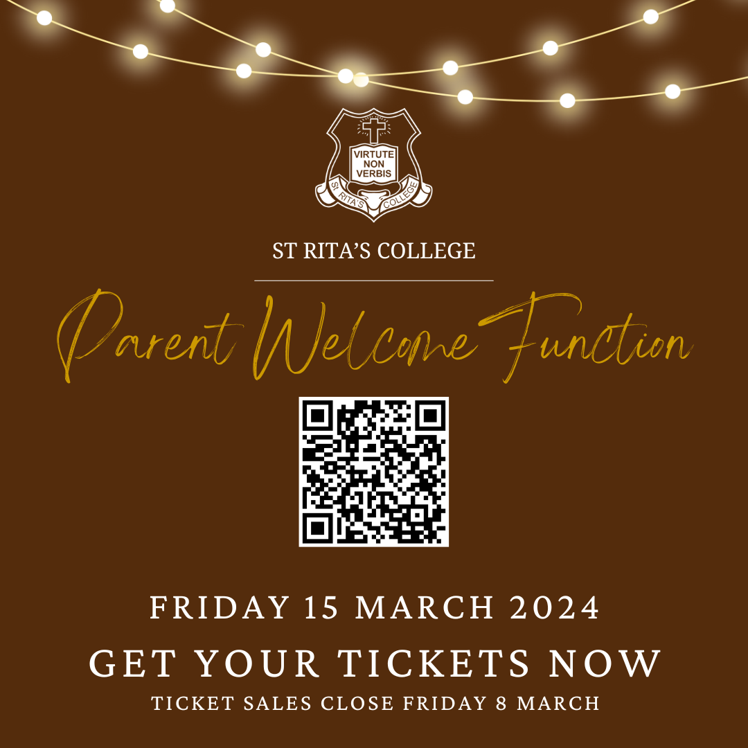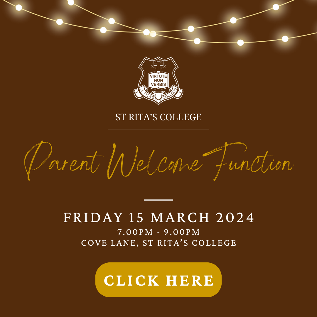 - Friday 15 March - Parent Welcome Function 7.00pm - 9.00pm, Cove Lane, St Rita's College $30.00 per person - adults only