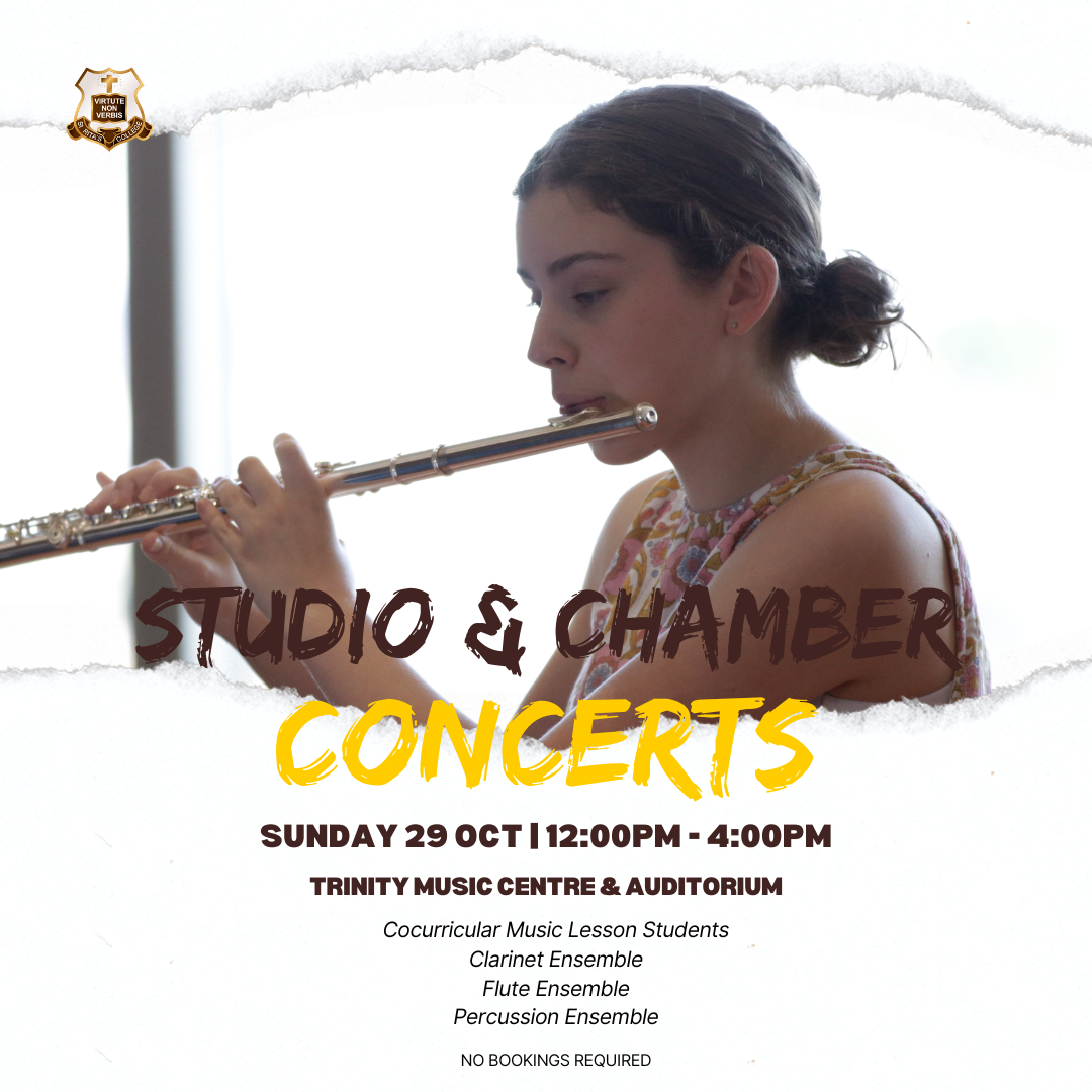 Our end of year Studio Concerts for instrumental and vocal students enrolled in the Music Program will be held on Sunday 29 October 2023. This afternoon will have concurrent concerts occurring in the Trinity Centre with students scheduled to play in one of the numerous 1 hour concerts throughout the afternoon. Please click here for further details.